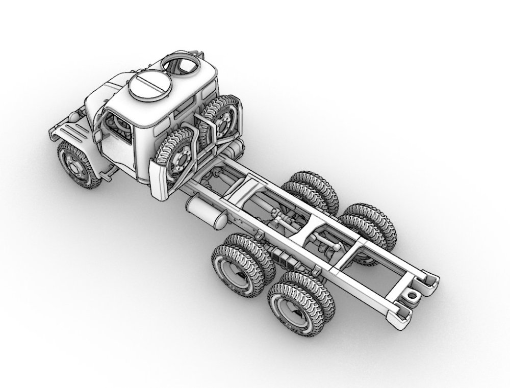 Rám je osazen dvěma kratšími vzdušníky, které odpovídají verzím cca začátku 60. let a pozdějším. (Zhruba od této doby se upustilo od instalace jednoho dlouhého a jednoho krátkého vzdušníku). Rovněž jsem zvolil variantu bez perforace plechu pod kapotou, které byly osazovány na rané série. Ztvárnil jsem tedy podobu "drtivé" většiny vyrobených strojů.